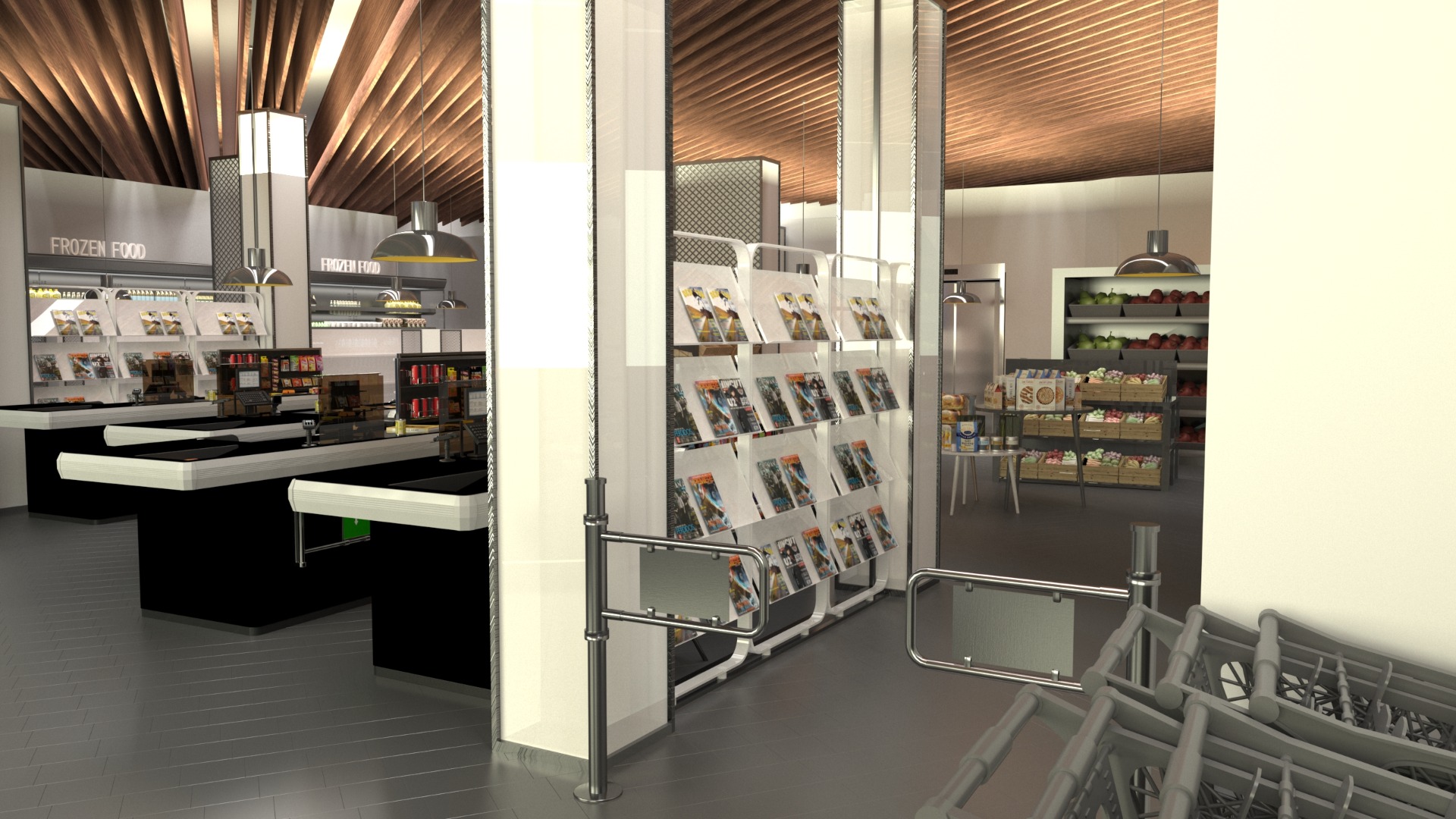 Benin'de tasarlanan 4 katlı süpermarket projesinde, her kat işlevsel ve kullanıcı odaklı bir planlama ile kurgulandı. Üst katlarda ev araç gereçleri, mutfak ürünleri ve züccaciye ürünleri için düzenlemeler yapılırken, renderlanan giriş katında meyve, sebze ve gıda reyonları konumlandırıldı.
